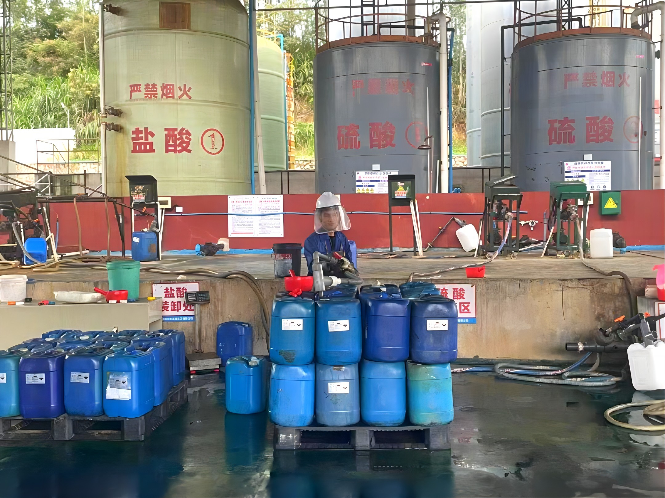 模擬車間人員因操作不慎,硫酸飛濺到身上,迅速脫去身上被污染的衣服,迅速關(guān)閉充裝開關(guān),用毛巾擦干凈后安排到淋浴器進行沖洗,沖洗時間30分鐘以上并涂燙傷膏。